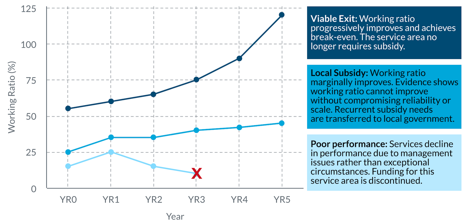 Results-based funding accelerates water service development and ensures that water keeps flowing. Water users pay for these services, but often not enough to cover the full service cost in rural and remote contexts. Results-based contracts help to address this funding gap. Over time, these rural water services can either transition out of requiring a subsidy or begin to access public funding locally. Interim catalytic funding is critical to service development in early stages when user payments do not fully cover operating costs.